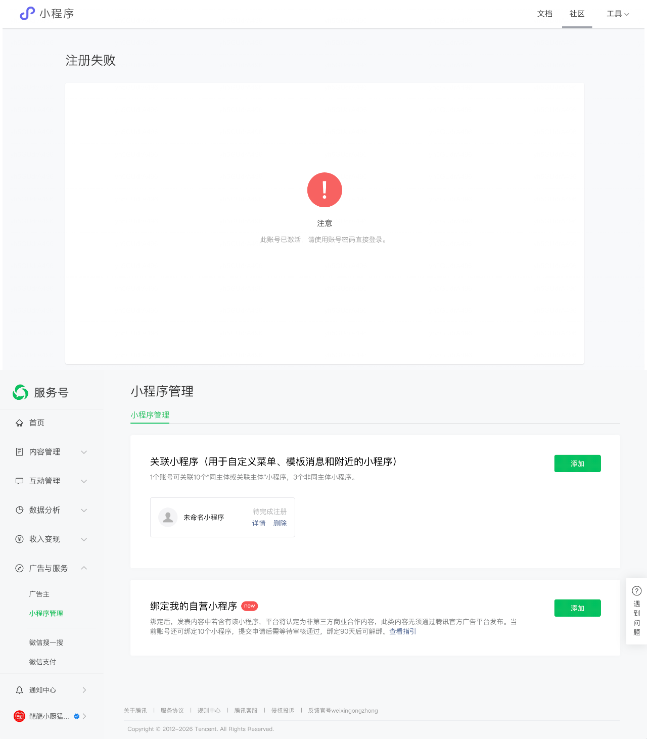 添加小程序,激活邮箱以后,没有任何提示没有入口怎么完成注册?
