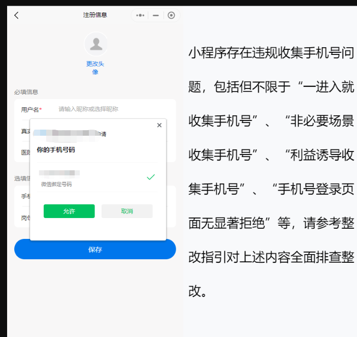 1、非必要场景不允许获取手机号,意思就是用户浏览商品不应该获取手机号,如果用户下单则可获取