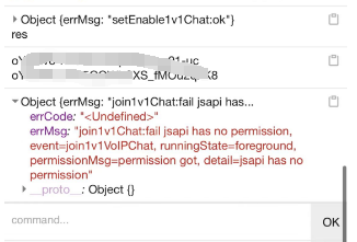 情况2:我的手机呼叫失败,查看响应结果如下:join1v1Chat:fail jsapi has no permission.event=join1v1VolPChat, runningState=foregroundpermissionMsg=permission got, detail=jsapi has nopermission