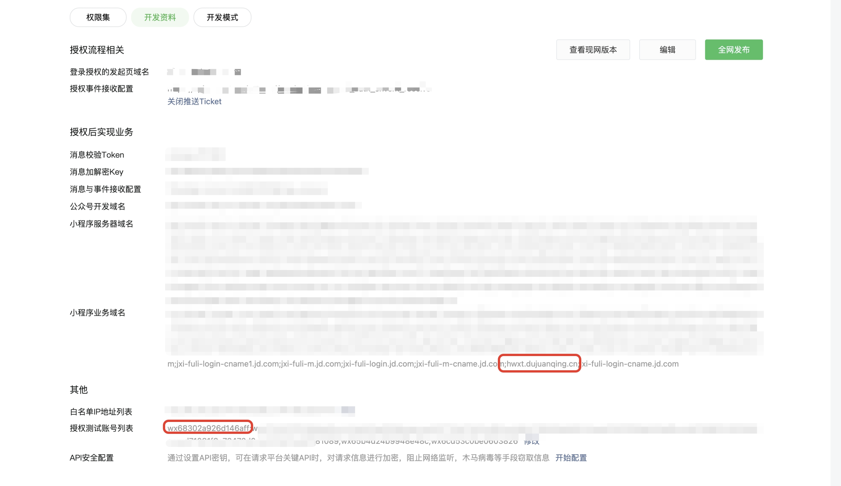 前提: 微信开发后台已托管给第三方平台, 平台APPID:wxca536045100224e3 类型:平台 问题描述: 1、已在平台设置业务域名,并全网发布成功 2、小程序 wx68302a926d146aff, 仍无法正常打开相关页面 3、验证文件链接 https://hwxt.dujuanqing.cn/1528885355.txt 问题截图: