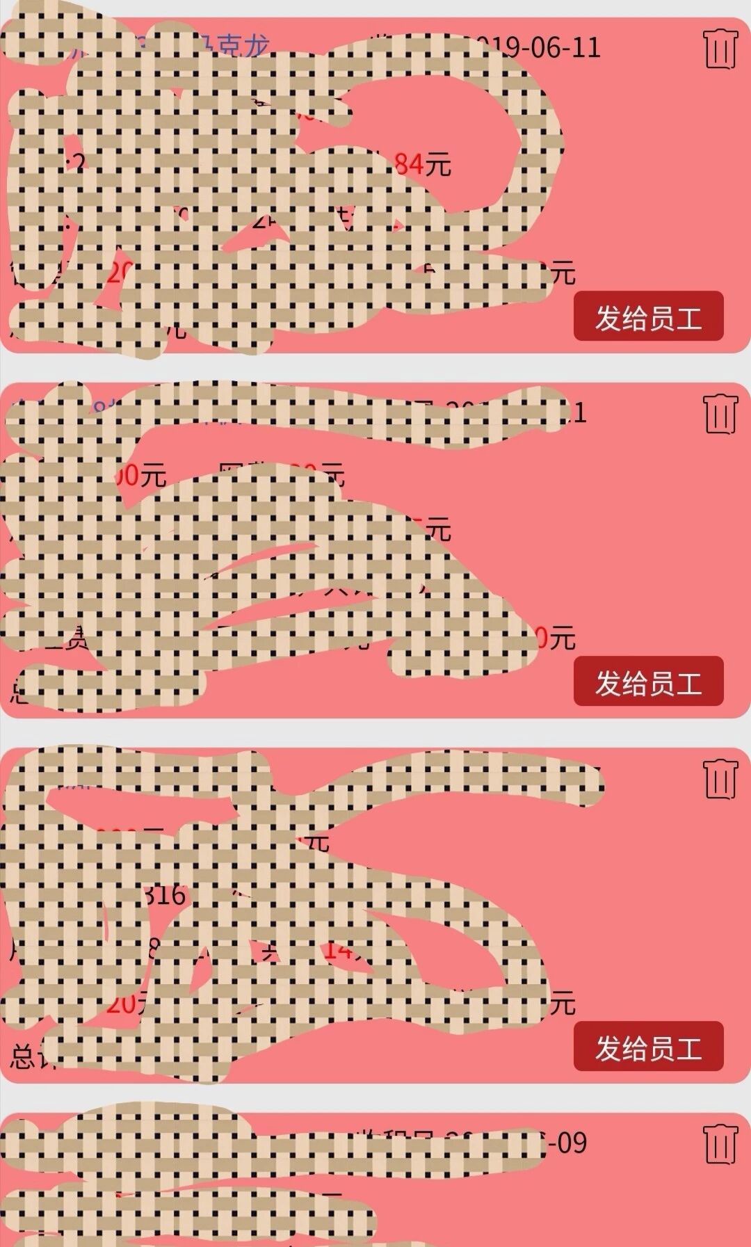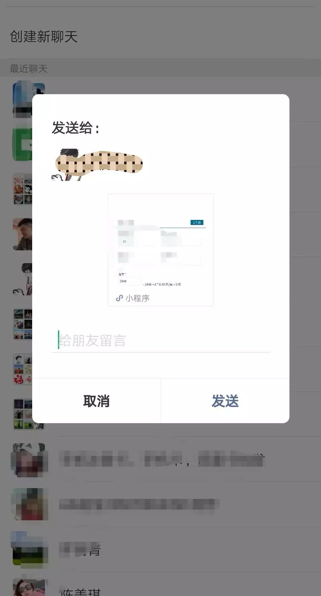 图1的每个红框代表一个员工的计件信息,点击“发给员工”按钮,就进入微信,选择相应的员工进行粘贴发送(发送前已将要发送的信息(即各个员工的计件详情)在代码里编辑好并set到剪切板了)。目前只能做到通过分享小程序时的留言,将计件详情发到各个工人的微信里,但这样顺带也罢小程序分享出去了,如何单纯的做到只发送信息呢?