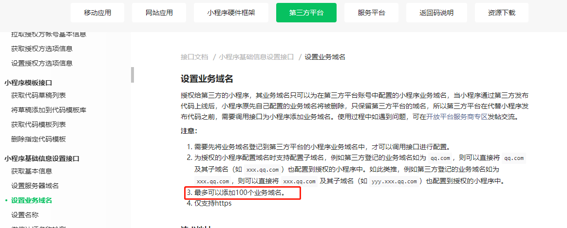 2、可以为授权代开发的小程序配置最多100个业务域名,配置给小程序的业务域名必须先配置到第三方平台的小程序业务域名