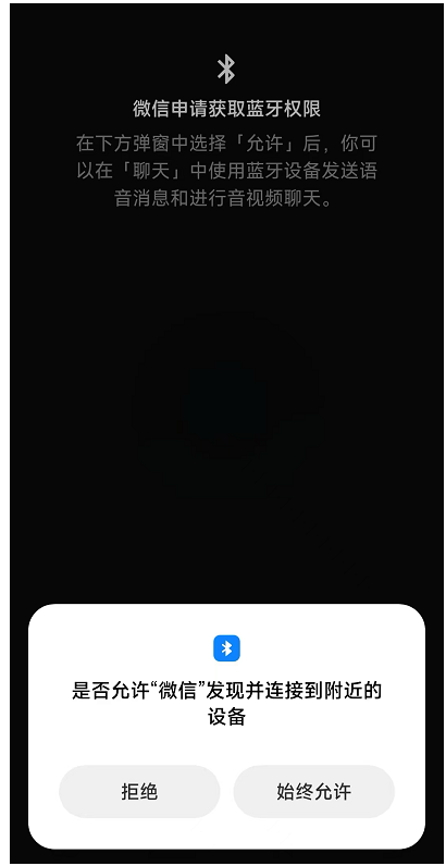 这个版本用蓝牙会用到 连接到附近的设备 这个权限。微信会弹框申请,如果用户拒绝了权限,将无法使用蓝牙。需要引导用户在设置页里手动开启权限
