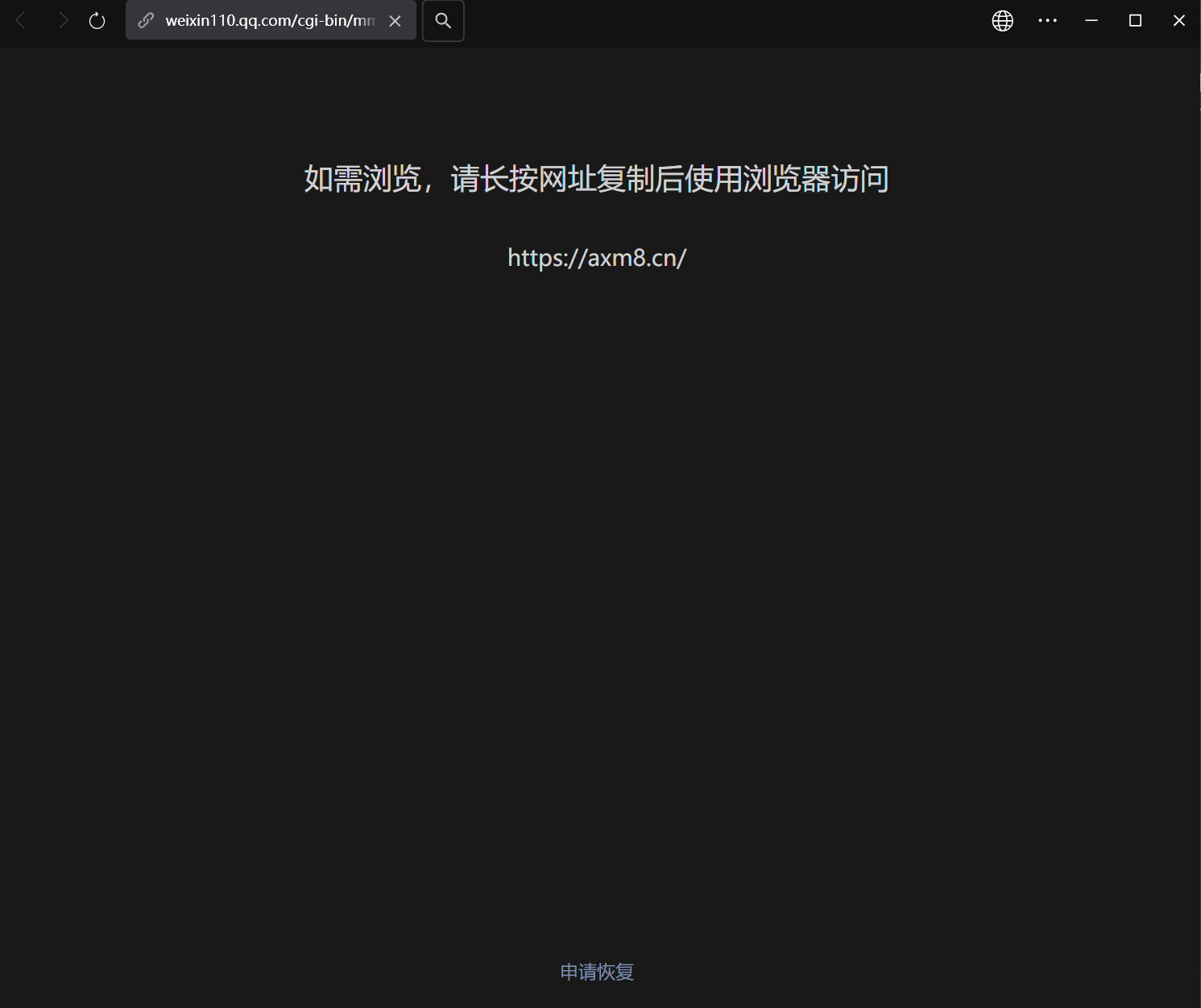 域名https://axm8.cn/在微信中打开显示:“如需浏览,请长按网址复制后使用浏览器访问”。我公司最近两个月注册的域名,准备上线业务了,才发现出现这个情况,经排查未发现异常违规内容,请核实下早日恢复,谢谢。