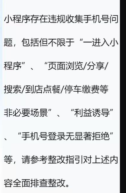 你好,经核实,小程序存在一进入小程序就收集手机违规问题,请根据指引进行调整:https://mp.weixin.qq.com/s/WHacxsm0J7D6Jb_Y_stdVA;