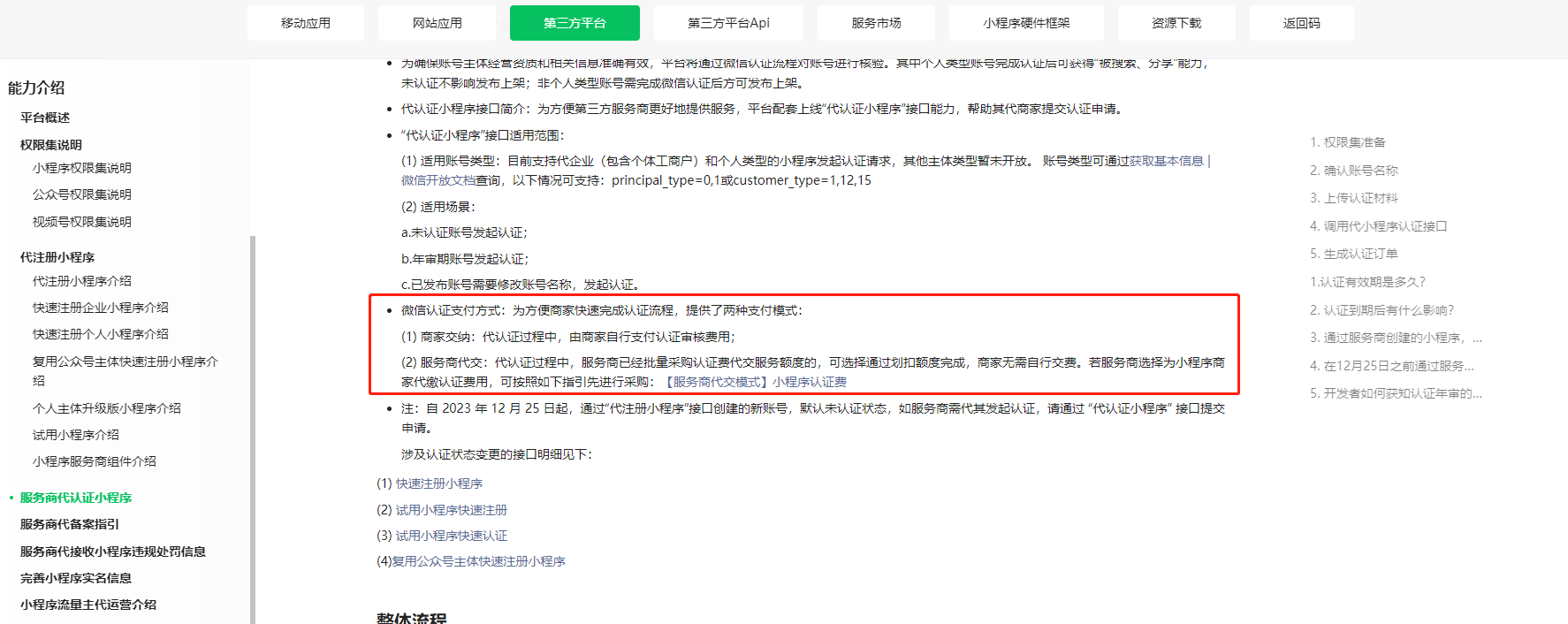 有两种支付模式,详情可查看服务商代认证:https://developers.weixin.qq.com/doc/oplatform/Third-party_Platforms/2.0/product/weapp_wxverify.html