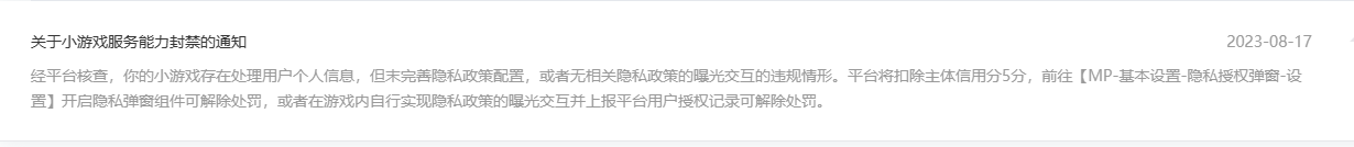 已自查游戏接口无存在处理用户个人信息的情况,并且已完善隐私政策配置如下图。8-17还是受到处罚了