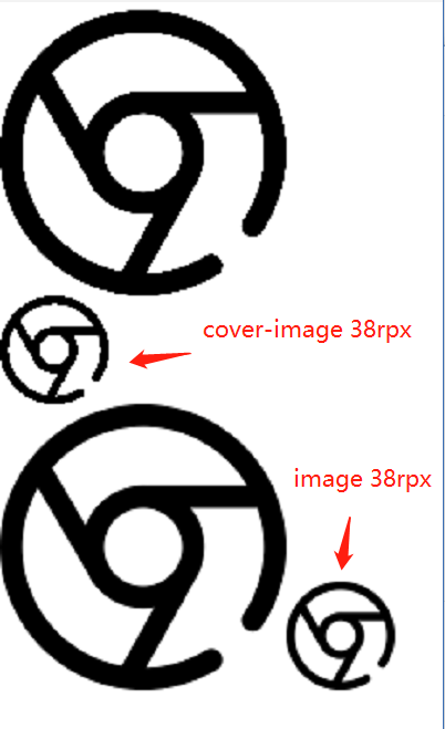 高像素png图片在小宽高的cover-image中会在边缘产生锯齿,图片中引用的图片像素为1200*1200,把引用图片的宽高设为100rpx后cover-image相比较image出现轻微锯齿,吧宽高设为38rpx时,cover-image产生明显锯齿
