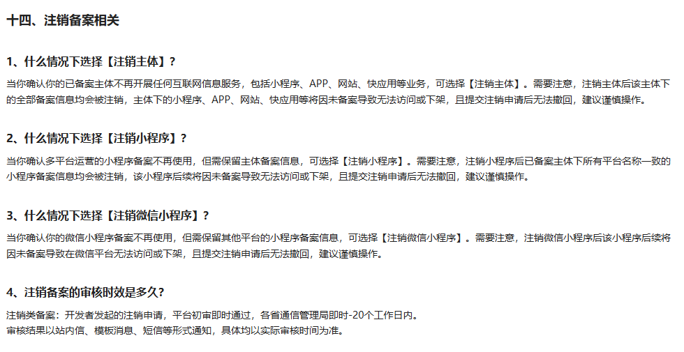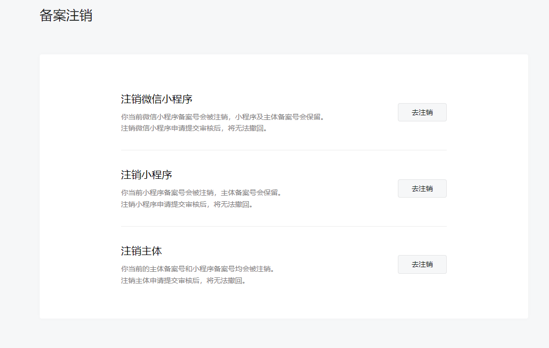 选择【注销微信小程序】,注销当前小程序备案号,注销后,及时用新主体进行备案。期间不影响小程序运行。