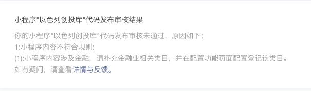 我们的小程序的主要是提供以色列创业公司信息查询工具,针对公司信息我们有[行业标签],可能有金融这个标签,而且这个标签也只是展示,并没有任何实际的功能,我们本身没有涉及一点点 金融的东西,我不知道这个拒绝理由是因为什么?难道金融这两个字都不可以出现吗?我们要怎么改才可以,已经因为这个原因被拒绝四次了,我们不从事金融领域的相关业务,为什么要补充金融业相关类目?
