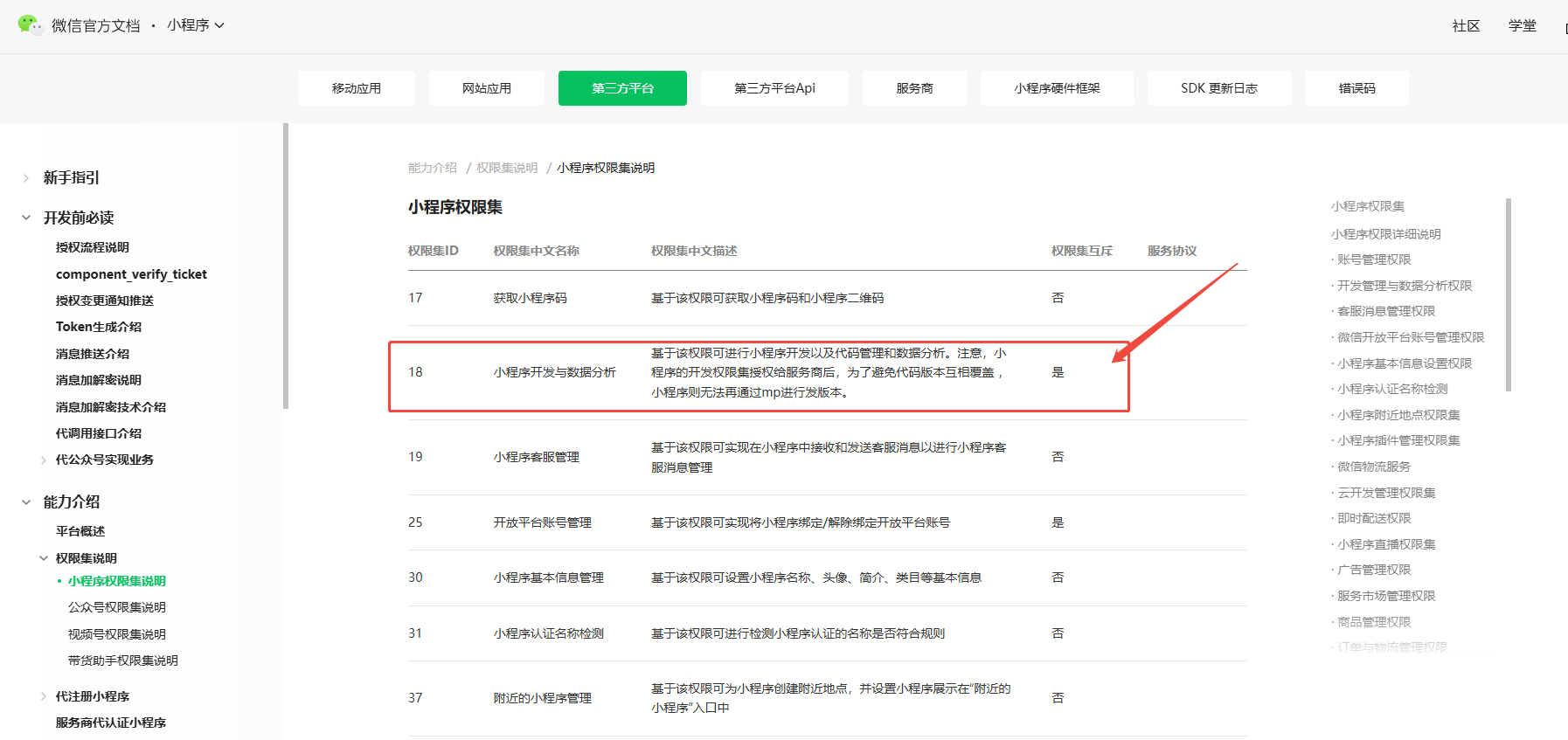 但是需要注意互斥权限集只能授权给1个第三方平台,例如:小程序【18】权限集互斥,只有授权此权限集的第三方平台才能进行代码提审和发布操作