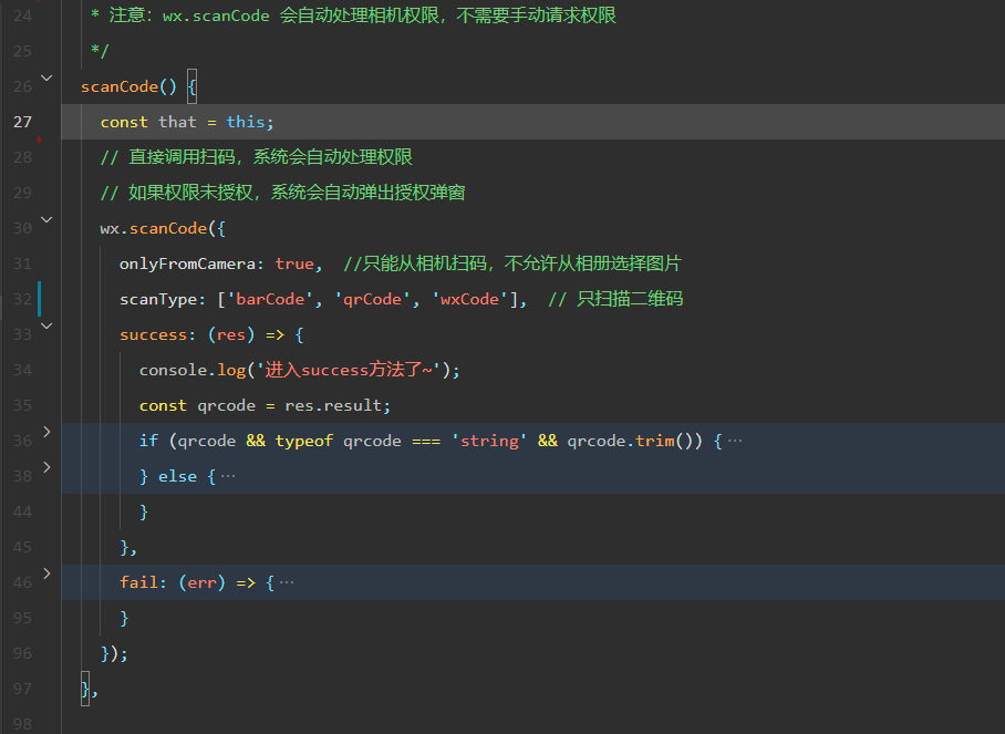 按钮上面再绑定scanCode方法,根本没有用,进入不了success方法中,只能无奈取消,才会进入到fail方法中,ios和安卓真机都测试了 都一样的毛病了,扫码了没有任何反馈~~!!!急!!!