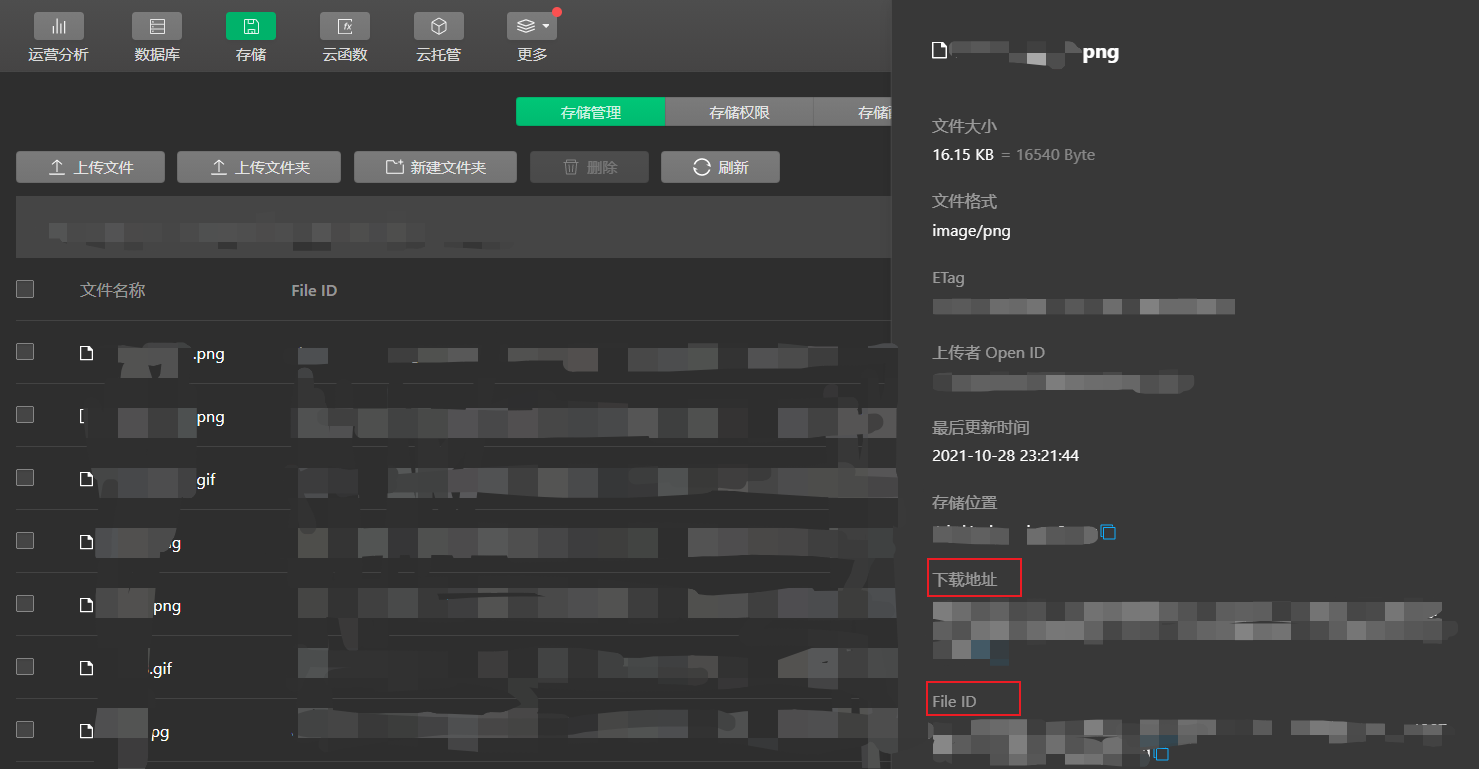 如果图片较多,推荐使用微信云开发,点击微信开发者工具左上角的云开发,在云开发控制台中选择云存储,可以上传图片,点击上传的图片就可以获得下载地址和File ID,从而支持小程序的快速访问,可以参考下图: