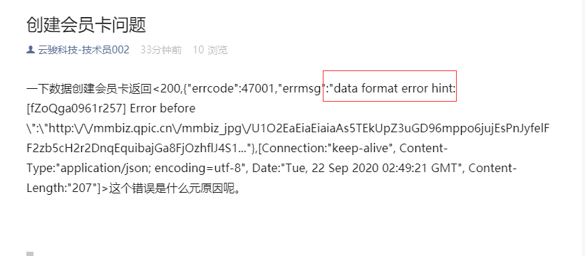 一下数据创建会员卡返回<200,{"errcode":47001,"errmsg":"data format error hint: [fZoQga0961r257] Error before \":\"http:\/\/mmbiz.qpic.cn\/mmbiz_jpg\/U1O2EaEiaEiaiaAs5TEkUpZ3uGD96mppo6jujEsPnJyfelFF2zb5cH2r2DnqEquibajGa8FjOzhflJ4S1..."},[Connection:"keep-alive", Content-Type:"application/json; encoding=utf-8", Date:"Tue, 22 Sep 2020 02:49:21 GMT", Content-Length:"207"]>这个错误是什么元原因呢。
