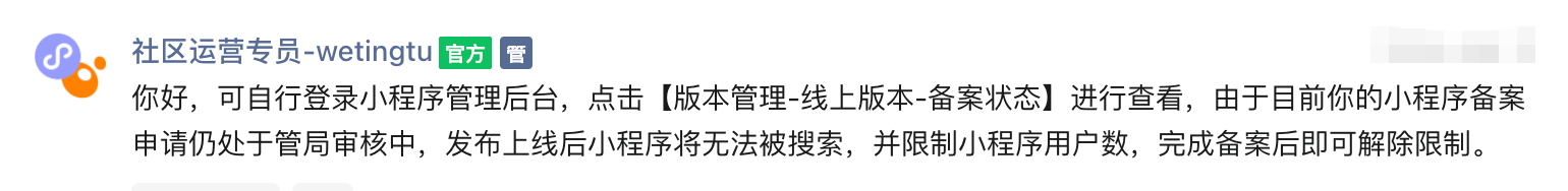 未完成备案的小程序发布上线后将会被限制搜索,建议等备案通过后再看看哈。
