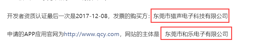 开发者资质认证最后一次是2017-12-08,发票的购买方:东莞市猎声电子科技有限公司