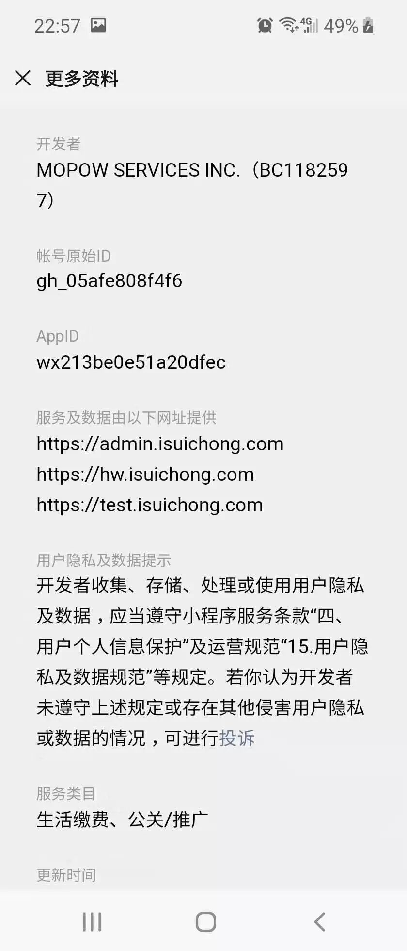 该小程序也是境外主体,同为共享充电宝的业务,选择一样的服务类目,我的却因为类目不符被拒绝,不知道小程序审核的标准和依据是否统一?