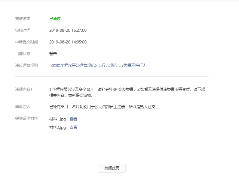 8.19接到的警告通知,马上就提交了新的类目。提交申诉后显示已通过。