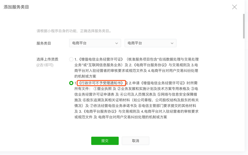 提交小程序电商平台类目需要提供一下(二选一)资料: