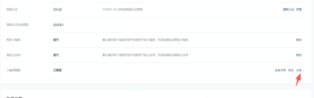 小程序备案注销步骤:登录小程序MP后台-基础设置-小程序备案-注销