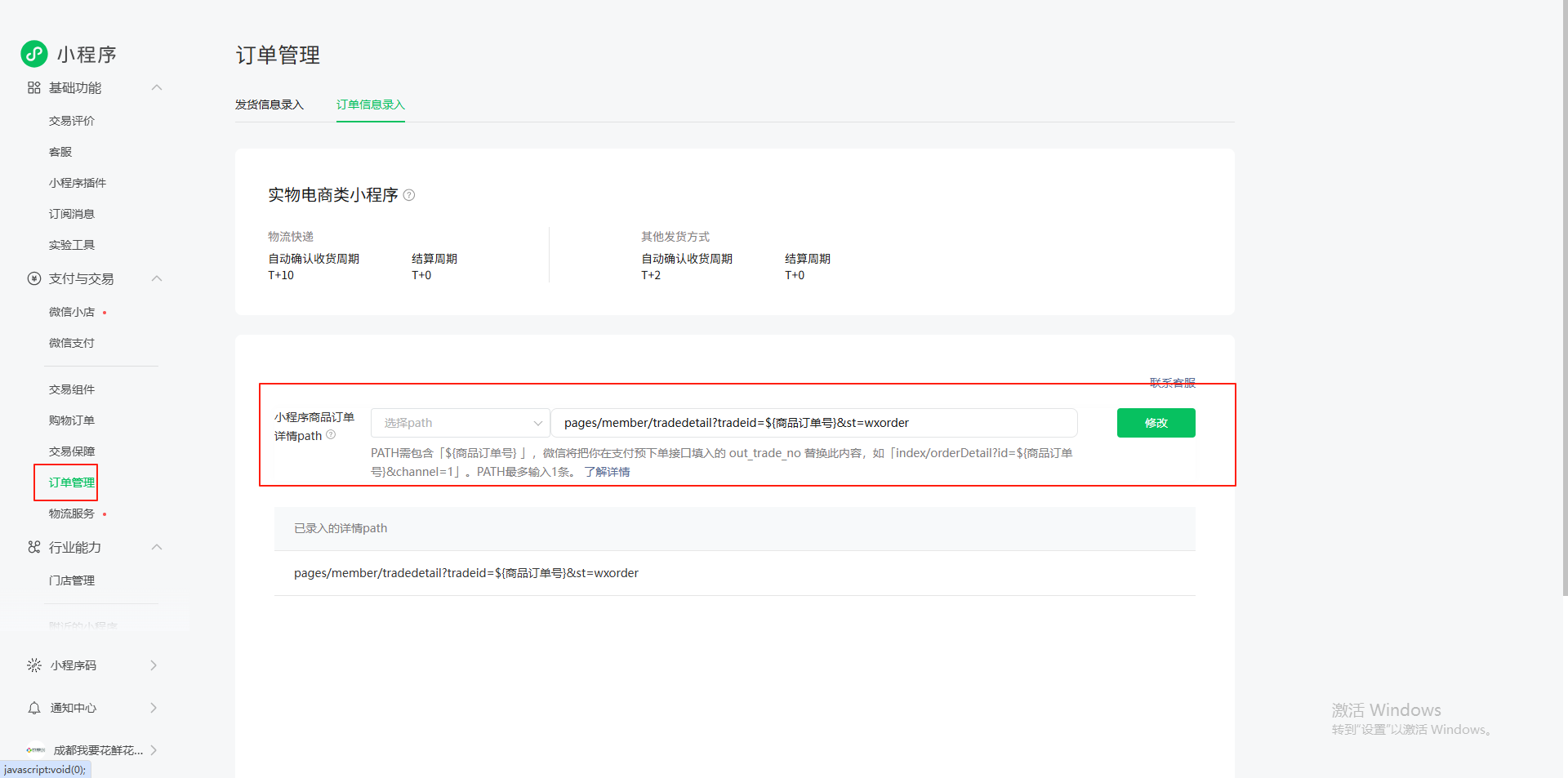 若还有其他疑问商家可在该路径进行咨询下。小程序管理后台https://mp.weixin.qq.com/ 支付与交易-订单管理-订单信息录入-右边联系客服咨询。