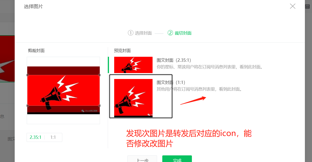 发现图文消息推送后的文章,在转发的时候,默认是封面图的图片icon,能否独立为文章配置单独的配置对应分享缩略图