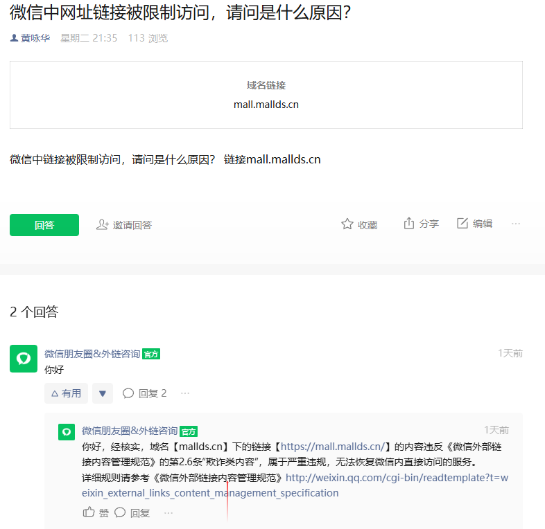 1.业务链接所有地址在微信内无法正常打开(其他浏览器访问正常),经自查及腾讯安全检测均未发现风险,访问受限已直接影响用户体验及业务推广。自查与检测结果,已通过【腾讯安全网址安全中心】检测(检测结果:未发现风险)