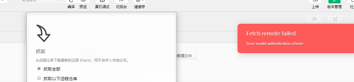 请确保在版本管理面板的设置 - 网络和代理里,正确配置了网络代理和认证信息(例如用户名和密码)。