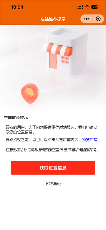 2、对此场景,我们的方案是:进入小程序需要获取用户位置时,进入一个引导页面。进行提示用户,提示页面也可以预览要访问的内容。此过程不强制要求,也不会阻碍用户操作。用户在引导页面进行操作获取,然后弹窗 官方隐私弹窗和位置获取权限弹窗。此过程也不是强制,同意拒绝都不会影响后续页面流程。