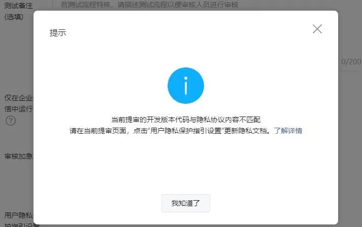 你好,一般是小程序当前提审版本隐私项与现网版本隐私项不一致,建议排查当前提审版本是否新增隐私项未补充,并根据弹窗提示入口补充隐私协议内容,详情可参考:https://developers.weixin.qq.com/miniprogram/dev/framework/user-privacy/
