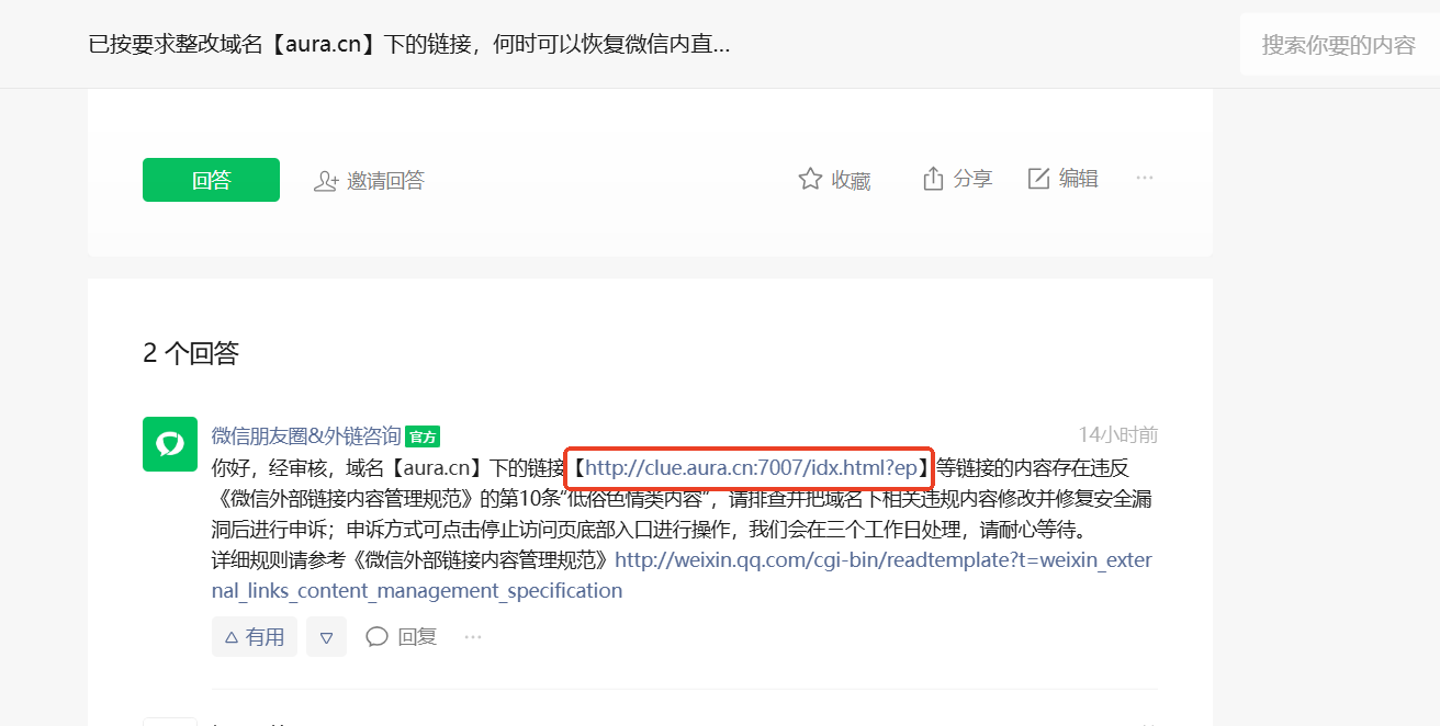 问题:微信内浏览器无法打开网址 aura.cn的链接,现象如截图