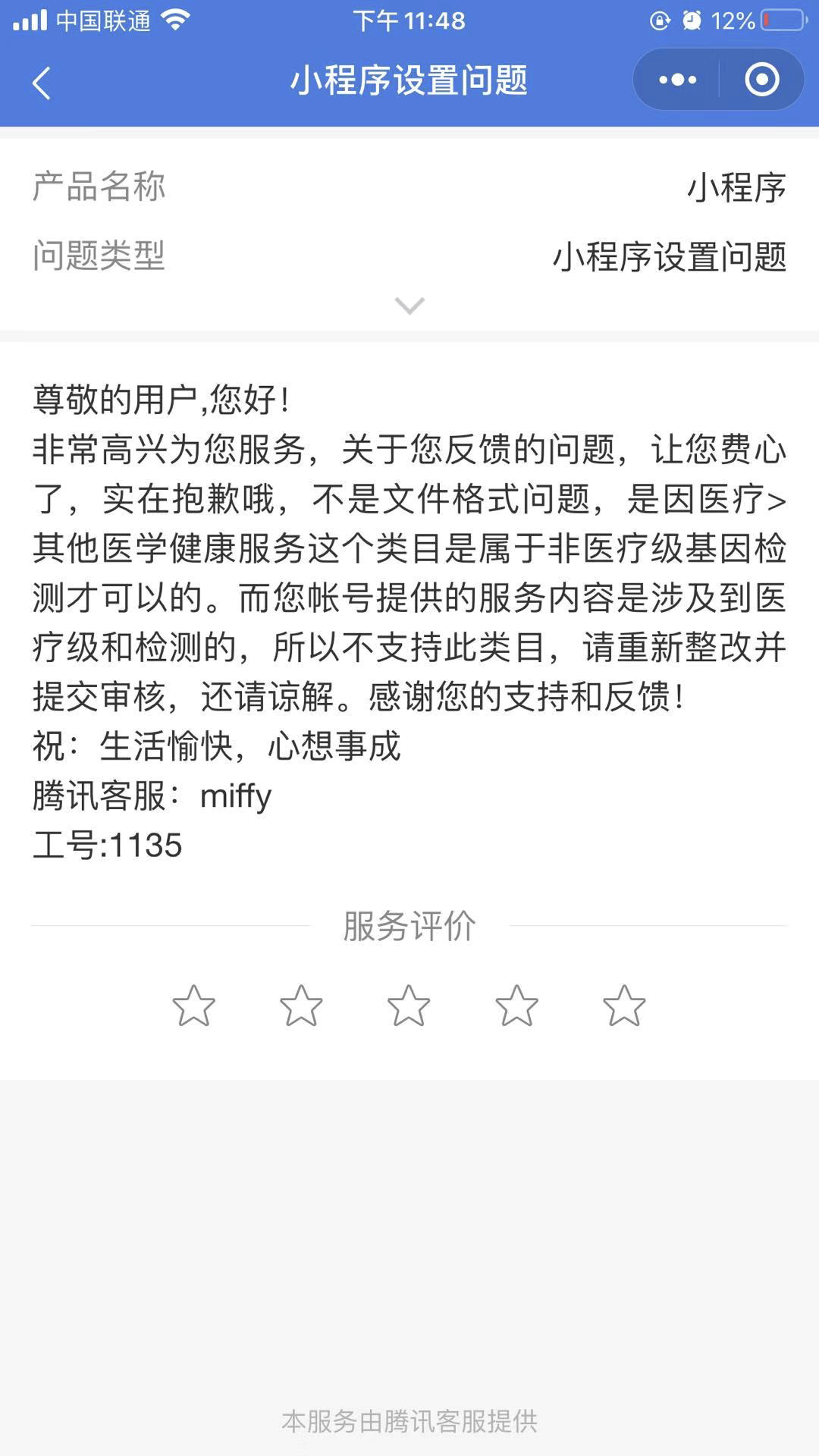 你好,按照现行规范,你的小程序涉及提供医疗级基因检测服务,属于尚未开放的服务类目