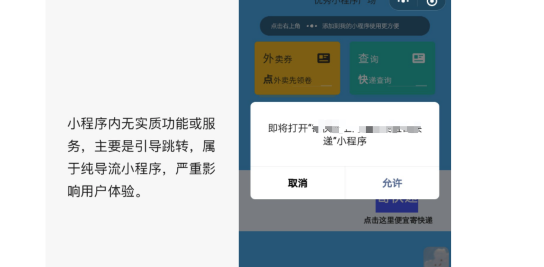 小程序是查快递的查物流信息的小程序,弄了一个跳转其他小程序下单寄快递。违规无实际运营内容仅跳转其他小程序,然后我发布了新的能寄快递的小程序后,申述不通过直接封永久。