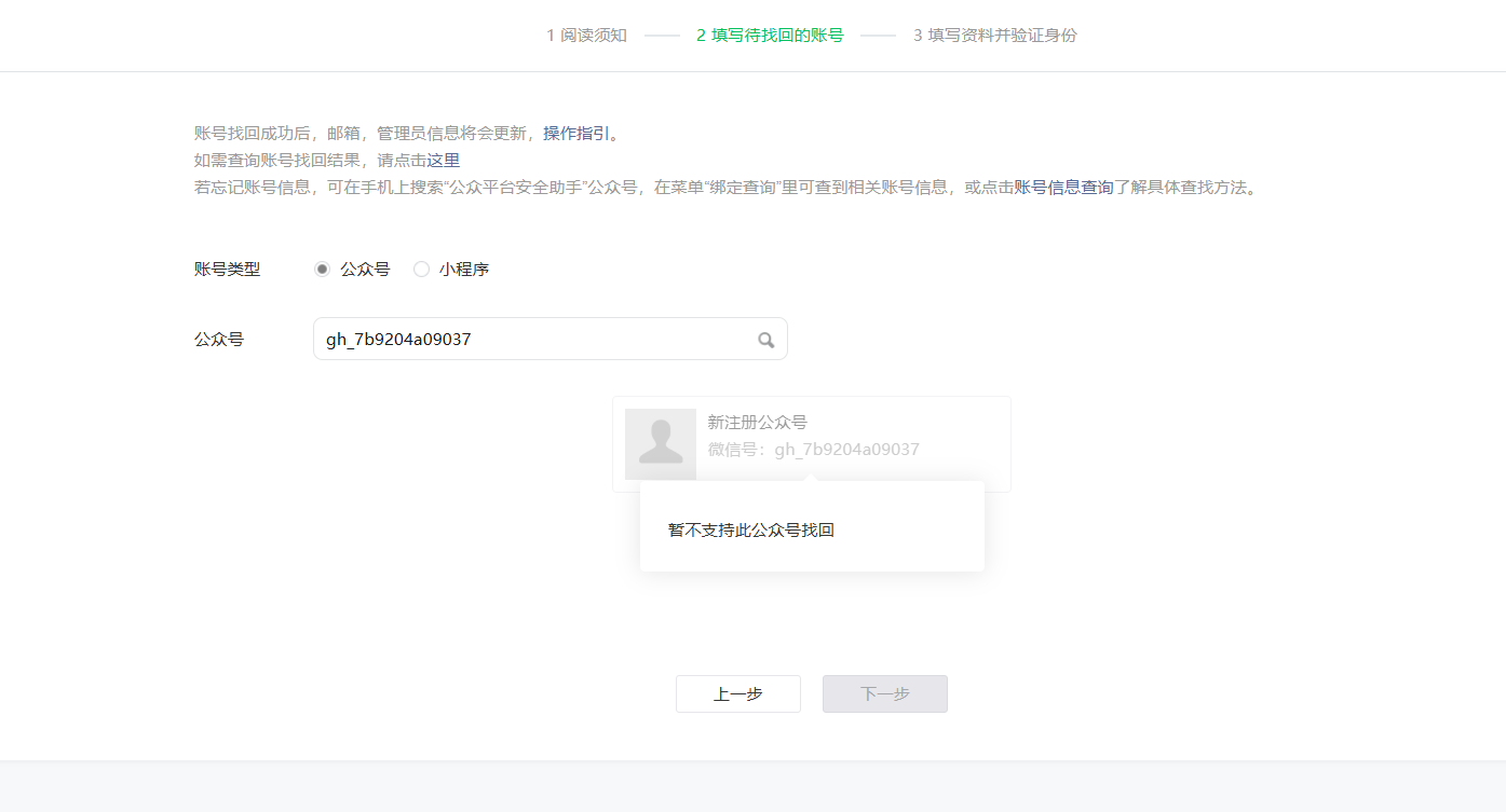 注册了一个微信公众号,在认证时提示身份信息被占用,查找发现是微信公众号:gh_7b9204a09037,想通过找回后解除,提示“暂不支持此公众号找回”,请问怎么办