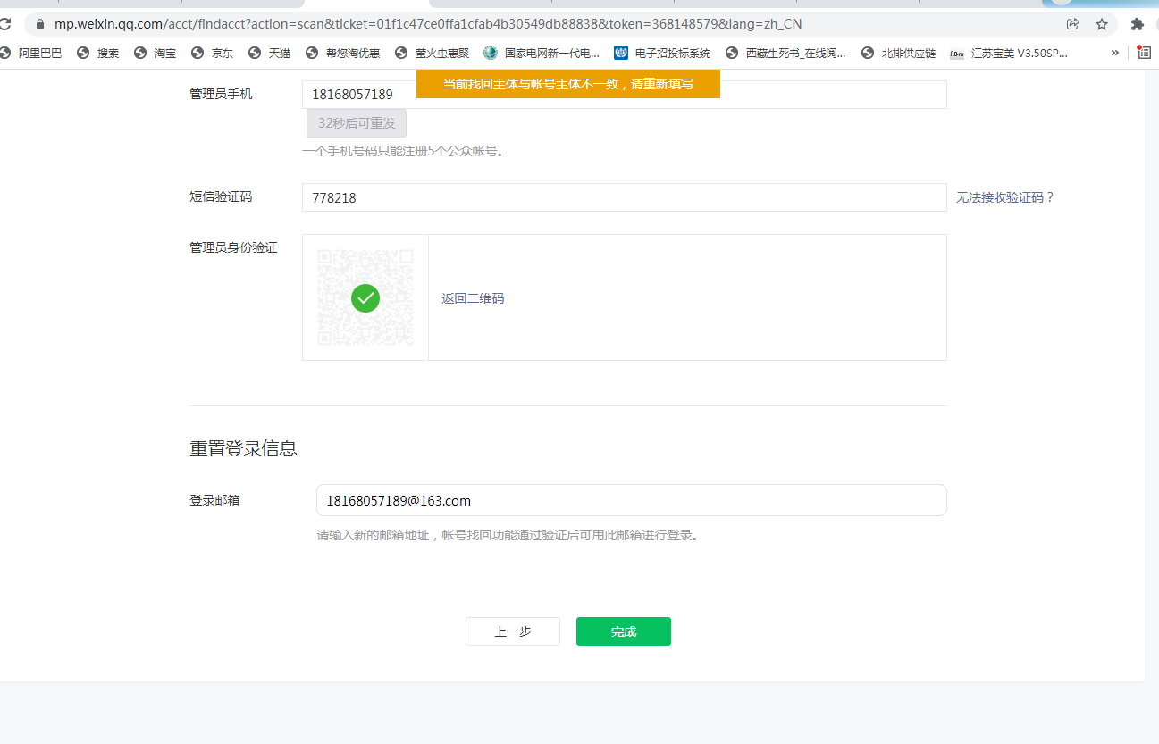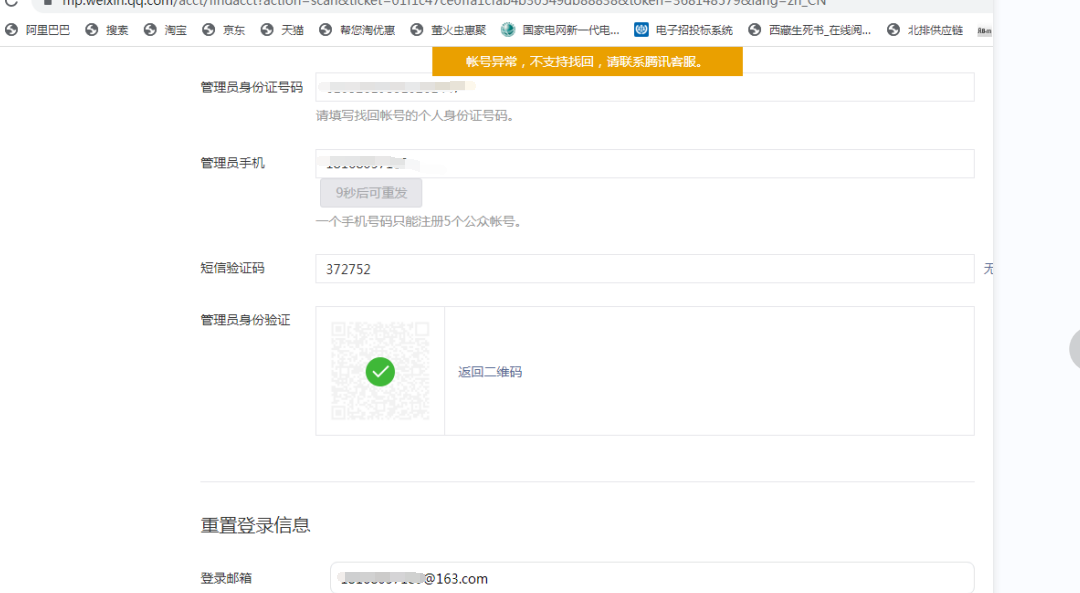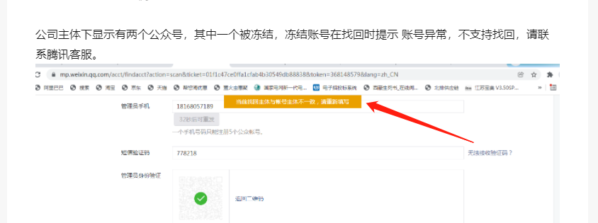 公司主体下显示有两个公众号,其中一个被冻结,冻结账号在找回时提示 账号异常,不支持找回,请联系腾讯客服。