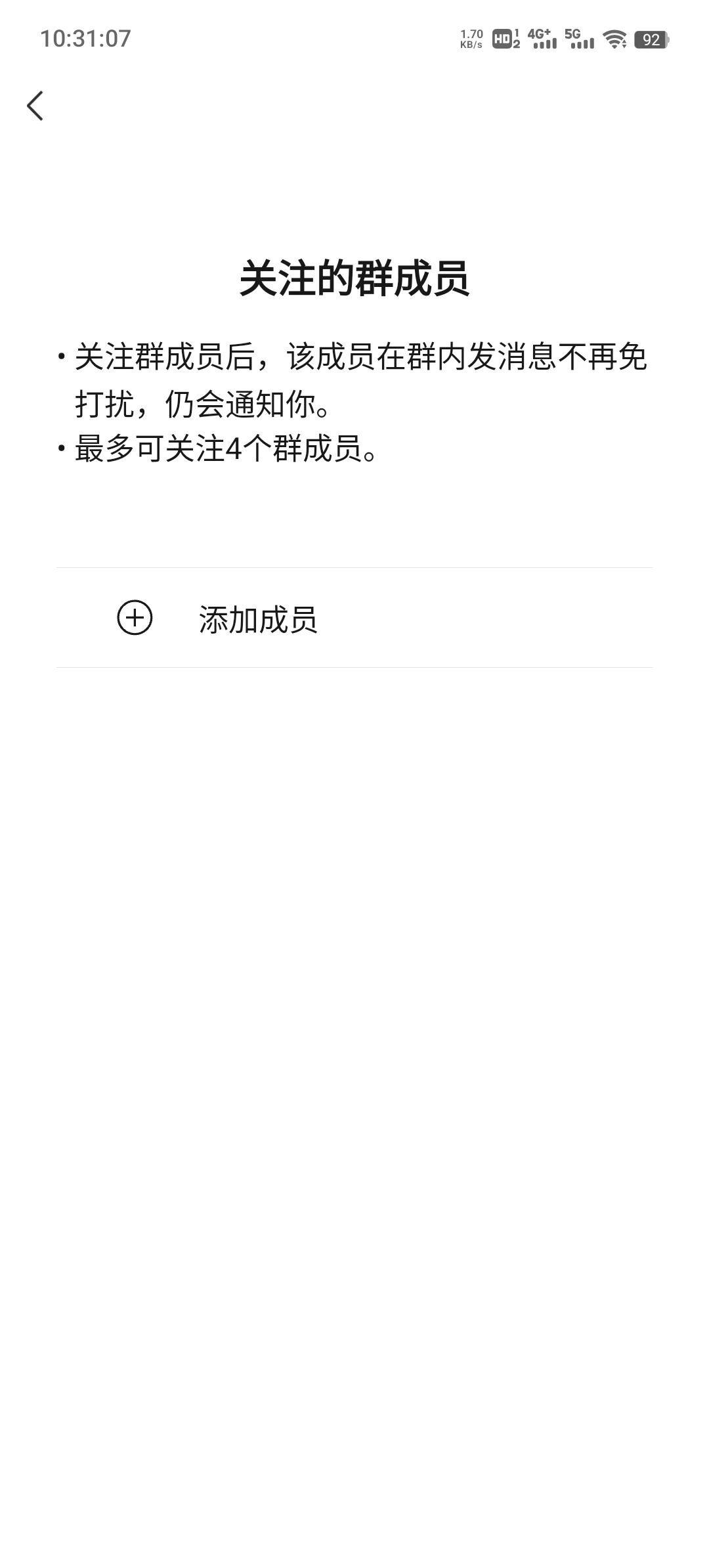 打开群里的免打扰开关后,关注好群成员后,退到微信主页再进去群里点击关注的群成员,会显示空白,也就是关注的群成员不见了,需要重新关闭消息免打扰再打开消息免打扰,才会显示出来人,并且有时候关注了群成员,群成员发消息并没有消息提醒。希望这个问题优化一下,谢谢。