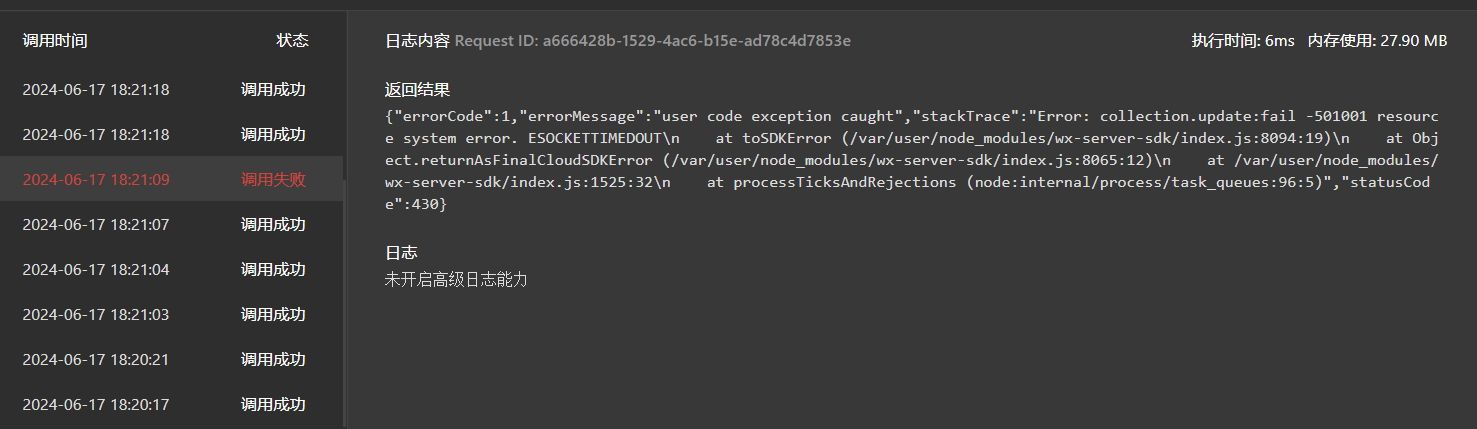 "user code exception caught","stackTrace":"Error: collection.update:fail -501001 resource system error. ETIMEDOUT..."如下图