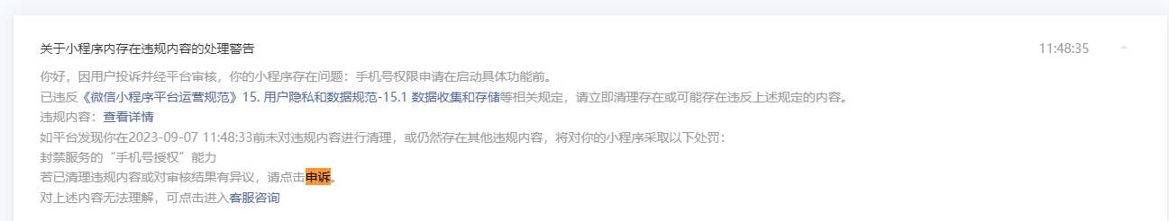 对于违规详情,用户可通过站内信处点击相关规定链接进行排查,平台对于违规小程序的处理是根据实际具体情况进行评估。如果对平台处理存在异议可发起线上申诉,会有专人处理。