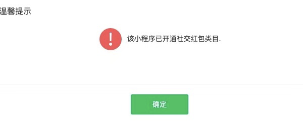 商户号开通小程序红包功能 提示 “该小程序已开通社交红包类目“ 提示如下