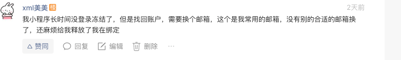 我小程序长时间没登录冻结了,但是找回账户,需要换个邮箱,这个是我常用的邮箱,没有别的合适的邮箱换了,还麻烦给我释放了我在绑定