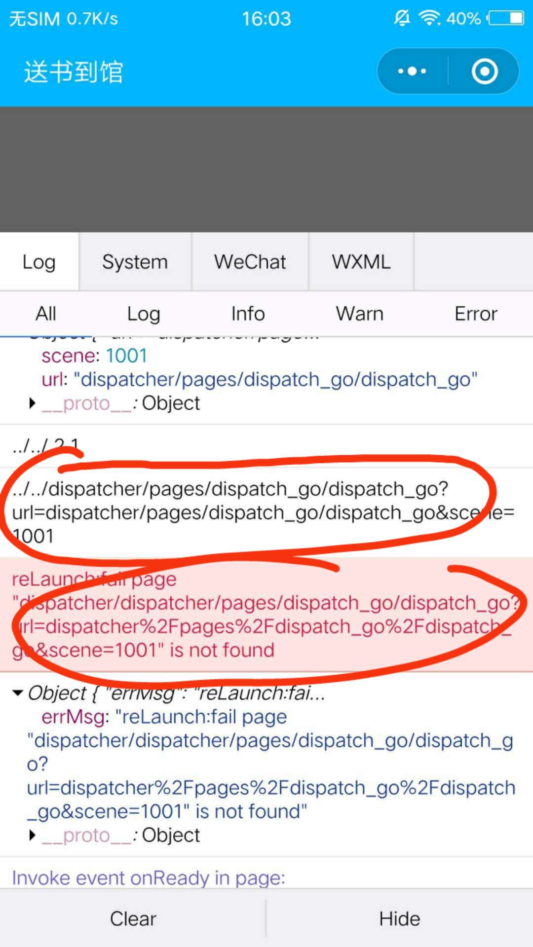 手机机型无关,因为小米,vivo,魅族,苹果都会出现,微信版本号和基础库版本号也无关,我切换了2.6.4,2.6.5,2.2.3都会出现,因为不是必现的问题,所以代码片段也没用,截取上可以很清楚看到这个问题,上面一个红圈打印的是,我传入wx.relaunch的url值,下面红圈是报错的路径值,我做了分包加载,所以传的相对路径;目前我用绝对路径规避了这个问题;