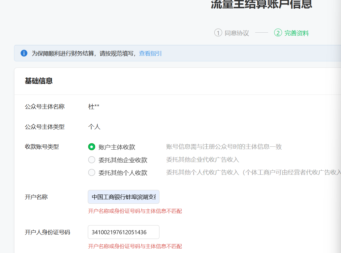 微信公众号运营者在完善流量主结算账户信息时,出现开户行城市与户籍地不在同一个城市,审核不通过怎么解决?