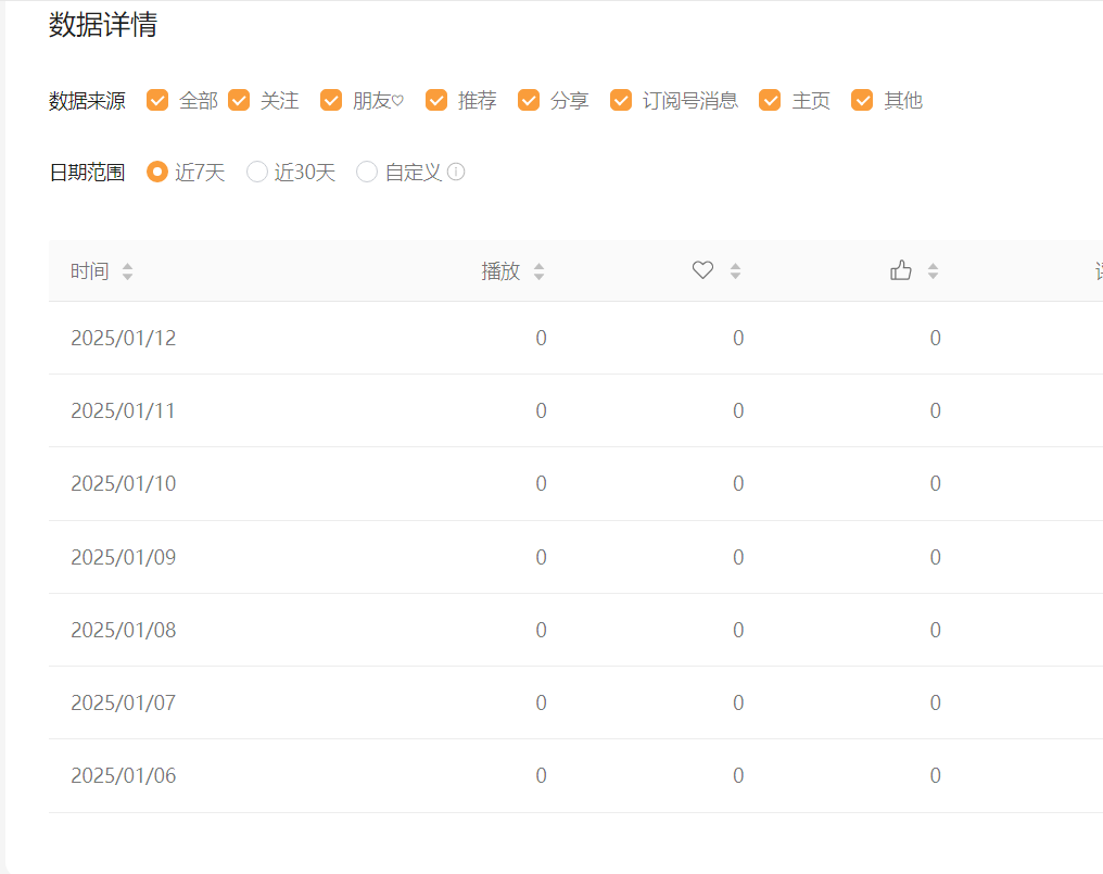 麻烦您给看一下,单条视频数据分析里面的 数据 和来源 都是完全没有显示的,已经换过浏览器和电脑 也是一样的为0
