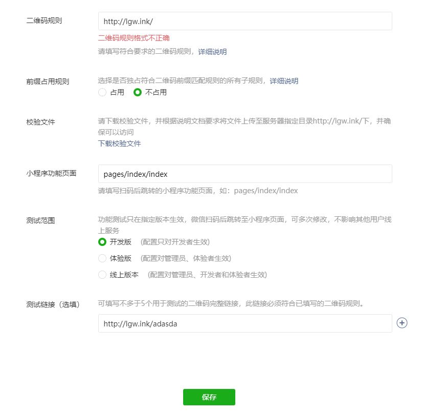小程序普通链接二维码配置不能成功,提未不符合规则,但域名(lgw.ink) 已经通过备案,相关验证文件也上传,也是遵守配置规则,但不知道哪里出了问题,请赐教!