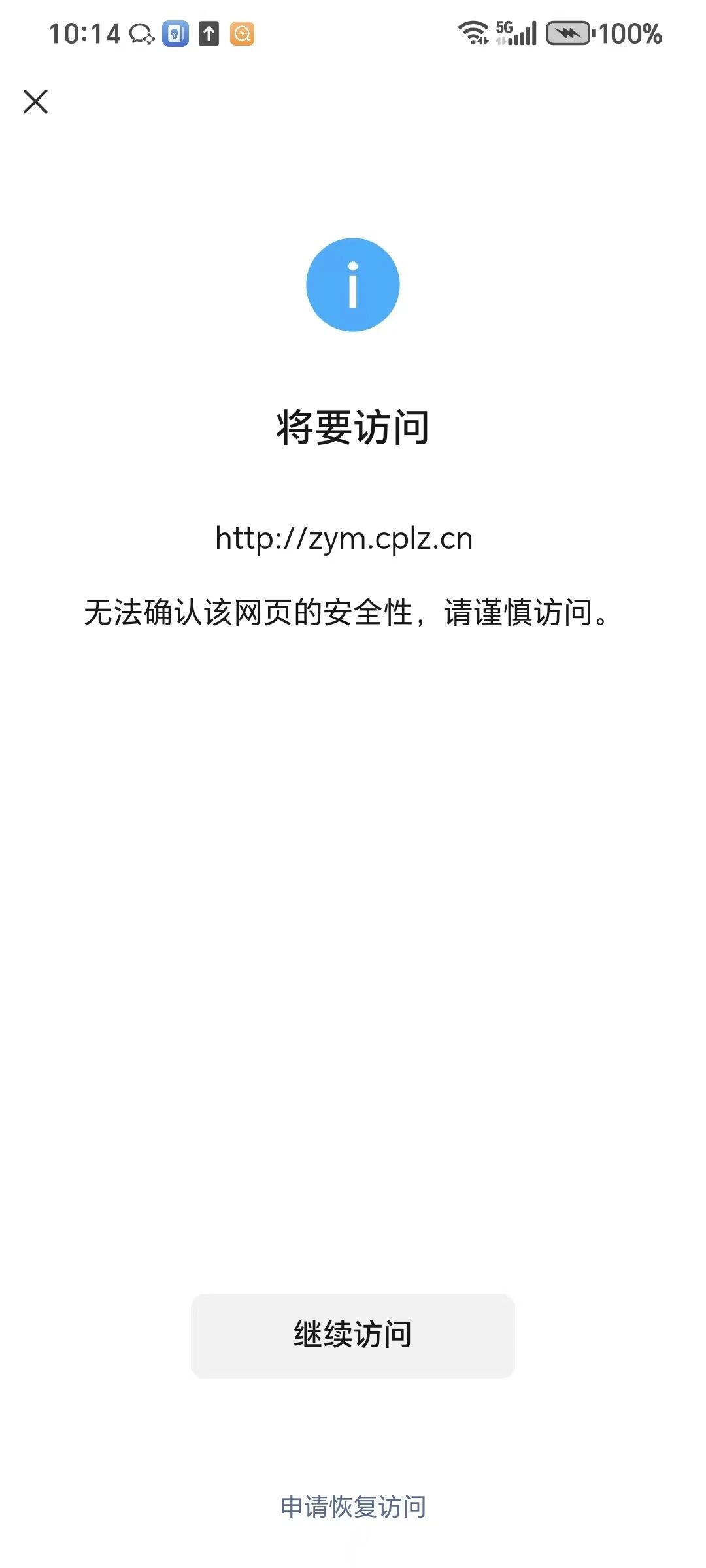 您好,域名cplz.cn在阿里云注册并备案通过,http://zym.cplz.cn/浏览器访问正常,我是网站开发者,访问时间如图2026/3/10,点开网址提示“无法确认该网页的安全性,请谨慎访问。”经检查网页里没有不安全的内容,请核实后帮忙解除拦截,谢谢!尽快处理,急急急,现在需要打开使用,谢谢!