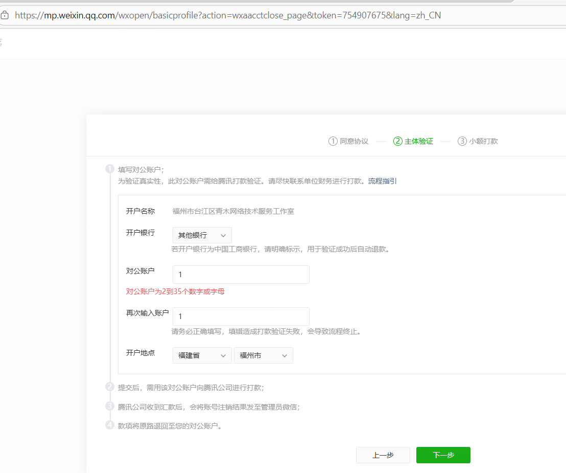 早先申请的小程序,认证了个体户营业信息,但是长期没有使用,没有对公帐号,现在想注销,卡在了第一步,要求输入对公帐号上,无法完成注销。