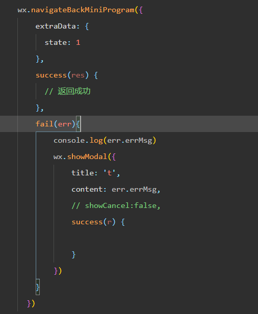 wx.navigateBackMiniProgram({ extraData: { state: 1 }, success(res) { // 返回成功 }, fail(err) { console.log(err.errMsg); wx.showModal({ title: '错误', content: err.errMsg, showCancel: false, success(r) { // 可在这里处理用户点击确定后的逻辑 } }); } });