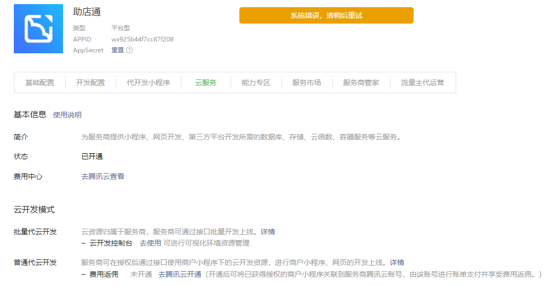 之前这一块是好的 然后云服务那边没有及时续费 现在已经续费 无法再打开这个页面 请问下我该如何做?