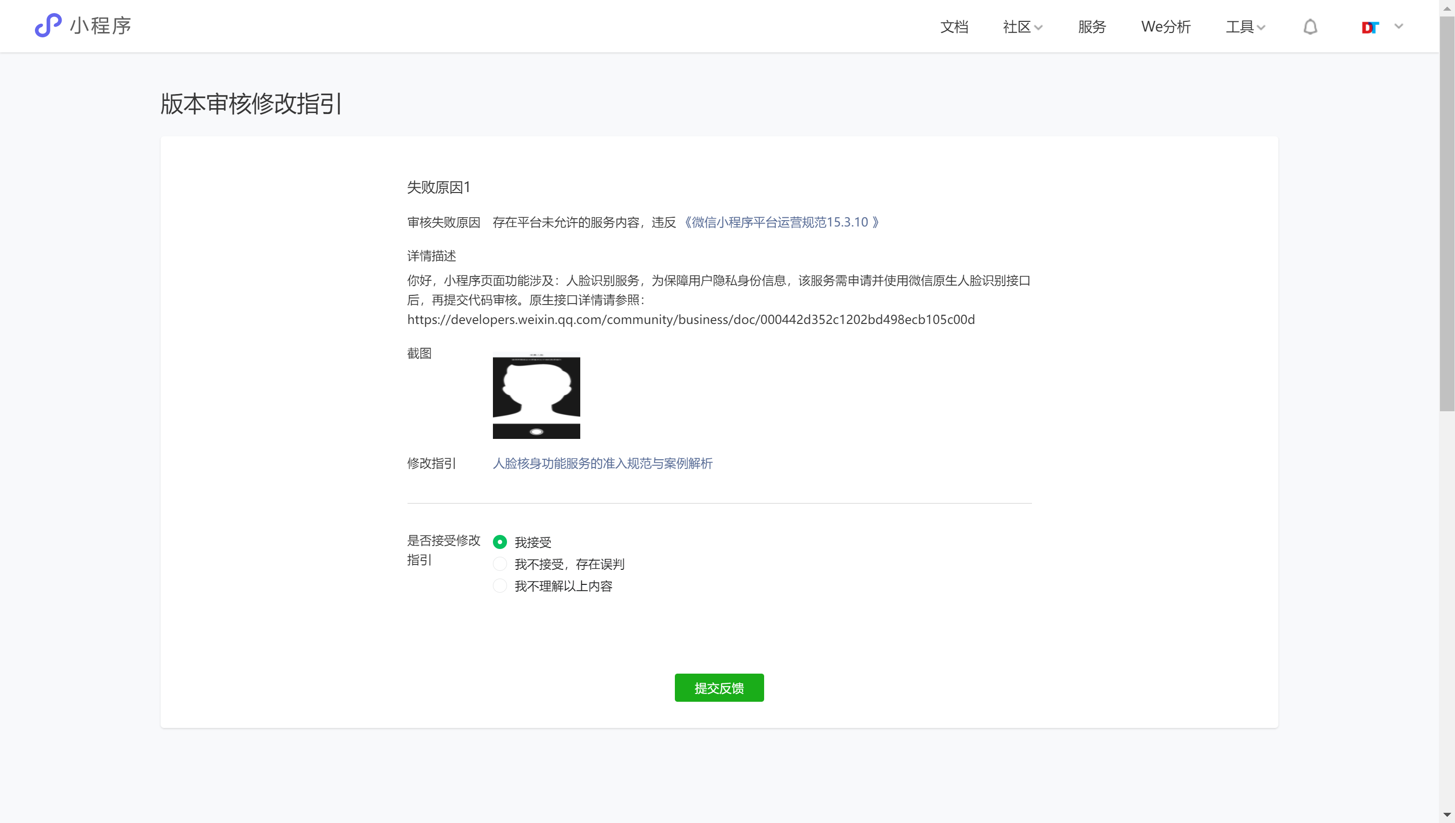 新版本小程序提审后发现由于人脸设备服务未使用微信原生接口导致无法过审(历史版本一直没有使用微信的原生接口可以过审)