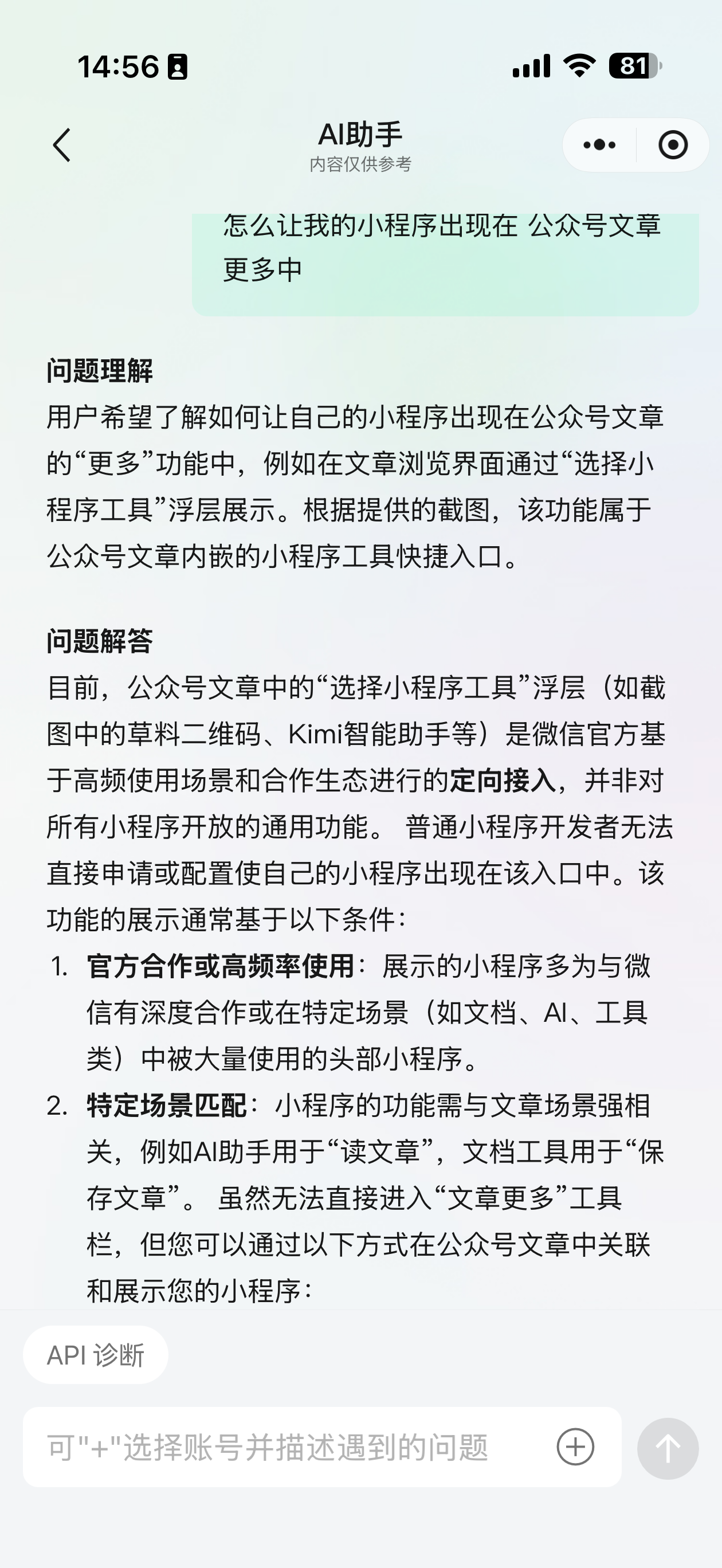 每个公众号文章 点击右上角->更多->用小程序打开(或者 用其他应用打开)会有一些小程序列表可以选择。如何让我的小程序出现在这个列表中,我的小程序代码已经实现接收url参数以及后续功能。。问了AI 说是要么定向和微信合作,或者是头部小程序才可能出现在列表中,不知道是否真的是这样。